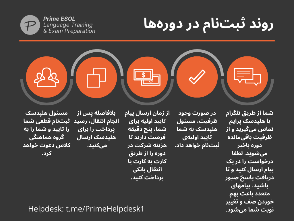 – لطفاً پیش از ثبتنام درمورد روال و سرفصلهای دوره مورد نظر، و کیفیت و شیوه تدریس مدرسین تحقیق فرمایید. این کار از طریق گفتگو با شرکت کنندگان پیشین در گروه هایی مانند گروه عمومی آیلتس پرایم در تلگرام (لینک عضویت را از هلپدسک دریافت کنید) امکان پذیر است. پس از شروع دوره امکان انتقال یا انصراف وجود نخواهد داشت.